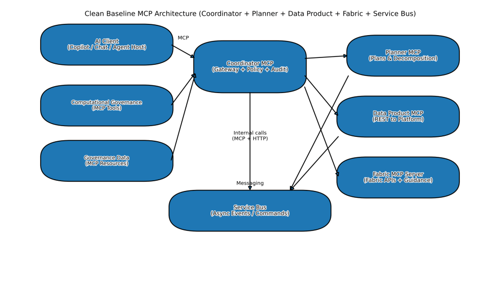 Start with resource taxonomy (contracts/policies/lineage/SLO/runbooks). Define the tool catalogue for computational governance (evaluate, approve, validate, provision, notify). Implement the Coordinator as the only public MCP endpoint. Add the Planner once you have stable resources/tools to plan against. Add the Data Product MCP to standardize product interactions (REST) and event emission. Integrate Microsoft Fabric MCP server behind the Coordinator for Fabric operations and best-practice context.