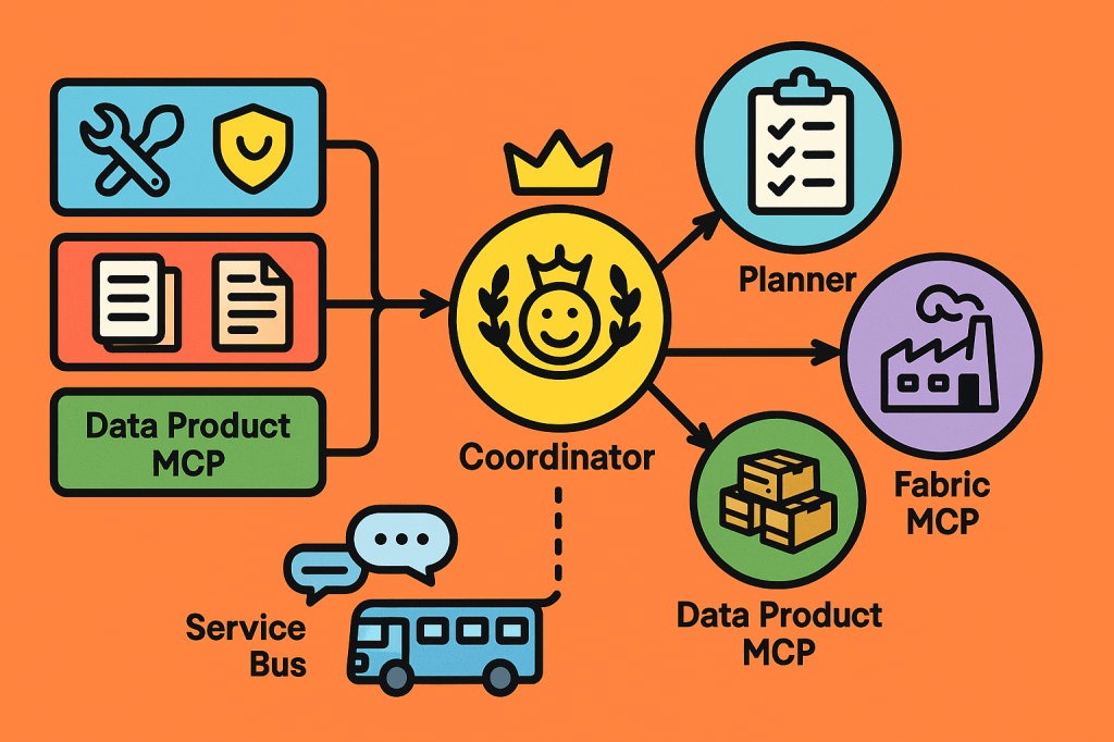 You operate multiple MCP servers with clear responsibilities: Coordinator, Planner, and Data Product Connector. You also integrate Microsoft’s open-source Fabric MCP server to work with Microsoft Fabric APIs and best practices.