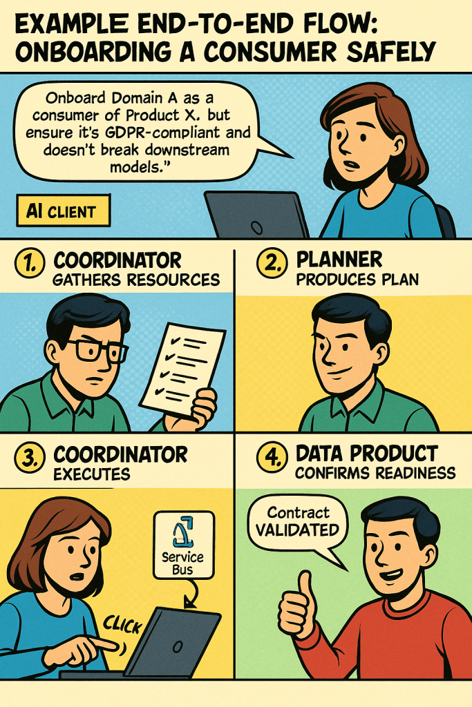User asks (AI client): “Onboard Domain A as a consumer of Product X, but ensure it’s GDPR-compliant and doesn’t break downstream models.”