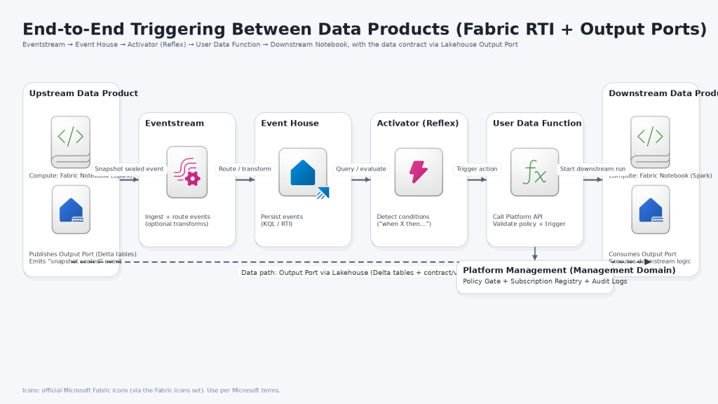 Your data products remain linked through Output Ports implemented as Lakehouse assets (tables/files), which are consumed contract-first.